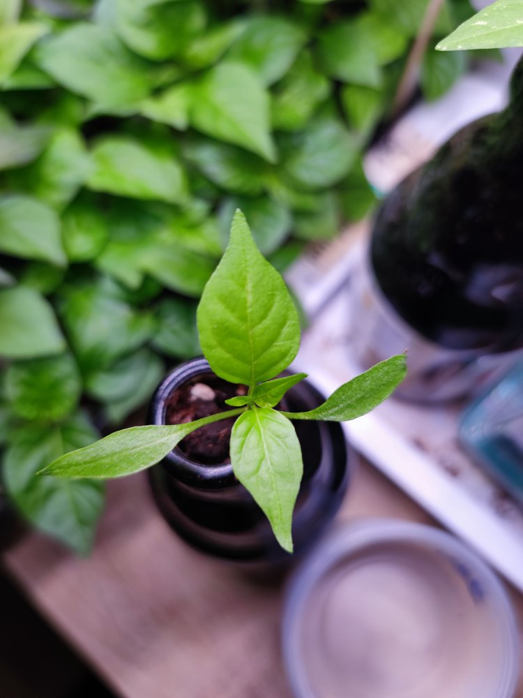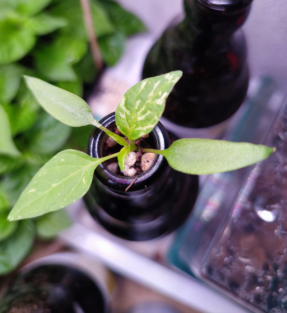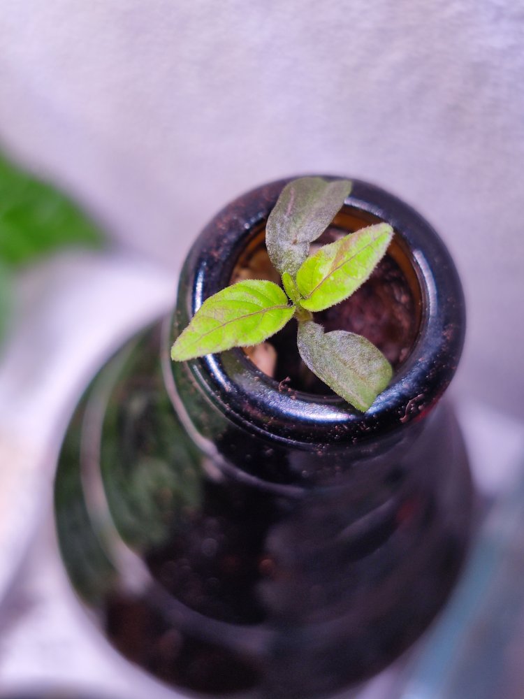 Noch sind nur die Keimblätter dran. Hoffentlich wächst der Ersatzkeimling vernünftig an, sonst ist schon meine erste Flasche raus. Der eine Keimling sieht immerhin vielversprechend aus.