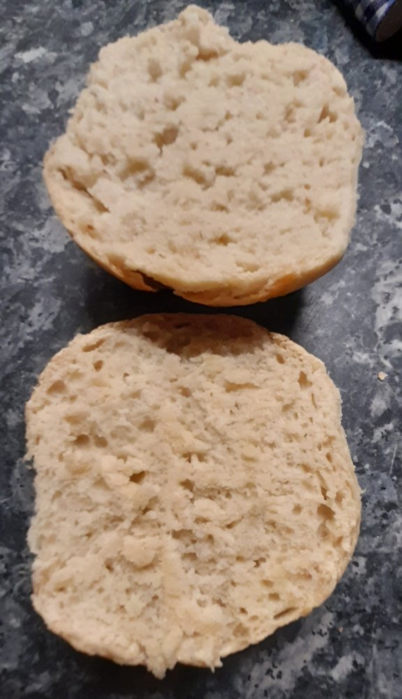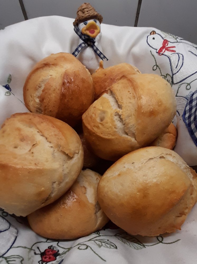 Innen sehen sie für mich etwas teigig und zu fest aus. Ich vermute es liegt an der kurzen Gehzeit. Lass den Teig länger ruhen vor allem nach dem Formen. Das 550er Mehl hat von der Körnung her schon sehr gute Eigenschaften und würde ich dem 405 er vorziehen. Dass mit dem Essig klingt interessant, so noch nie gehört. Wie spiegelt sich das wieder im Geschmack?Ich hatte gestern ein Schwätzchen mit nem Mütterchen aus der Nachbarschaft.