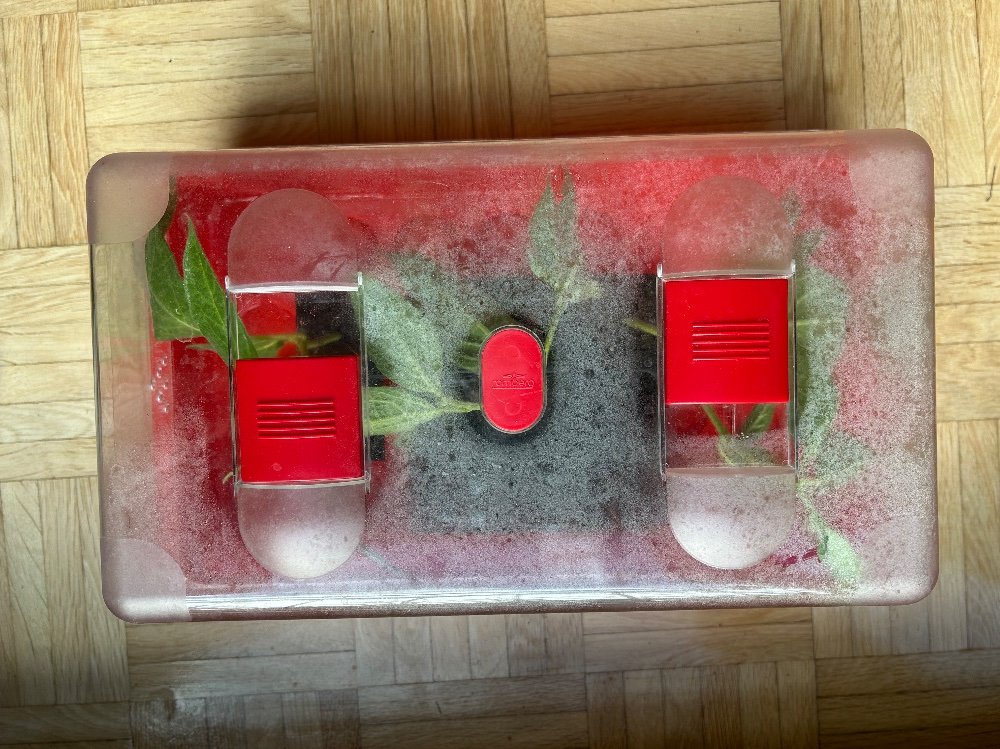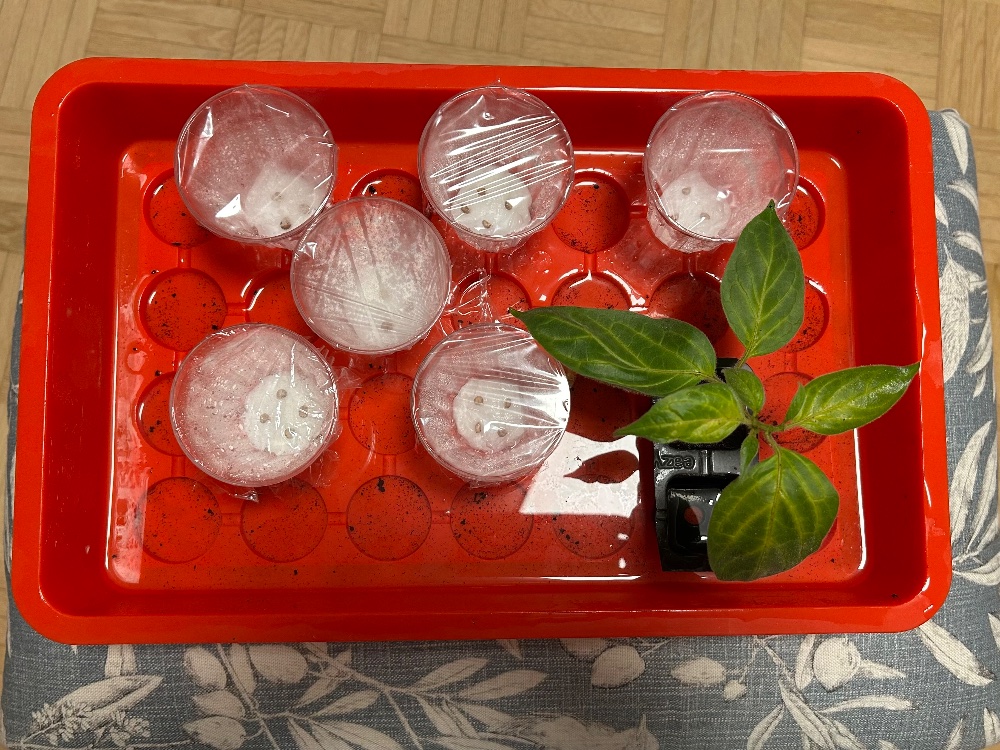 Neben Versuchen mit Stecklingsklonen ziehe ich meine Sukanyas noch mal aus eigenen Samen, die ich 2023 gesammelt habe. Start war 15. November nach einweichen in Leitungswasser (für 2 Tage) ging es am 17. ab in die Becher und ins warme Minigewächshaus bei ca 23-27 °C, siehe Bild. So ist der Temperaturgradient dort je nach Stellplatz. Die Methode die ich nutze ist quasi, wie hier im Tomatenforum beschrieben von wemu.