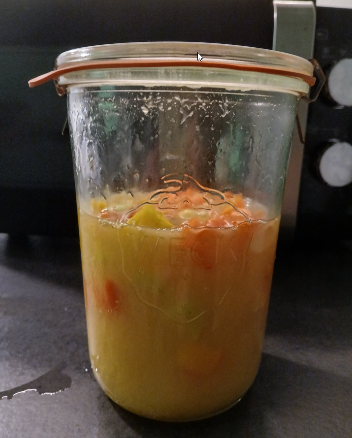 Jalapeno Habanero Tomate Zwiebel Knoblauch Fermentation abgeschlossen. Die Habaneros sind aus dem Supermarkt, die Jalapenos aus eigener Ernte.