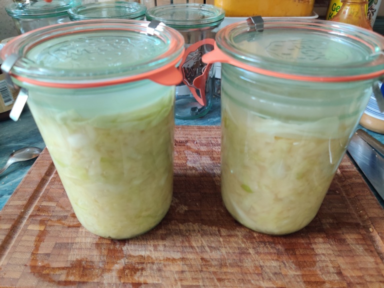 Der Kimchi ist fertig und auf etwas mehr als zwei Gläser abgefüllt. Zwei Tage bei Zimmertemperatur, dann soll er in den Kühlschrank. Ich muss da erstmal Platz machen für die nun vier Weckgläser :)