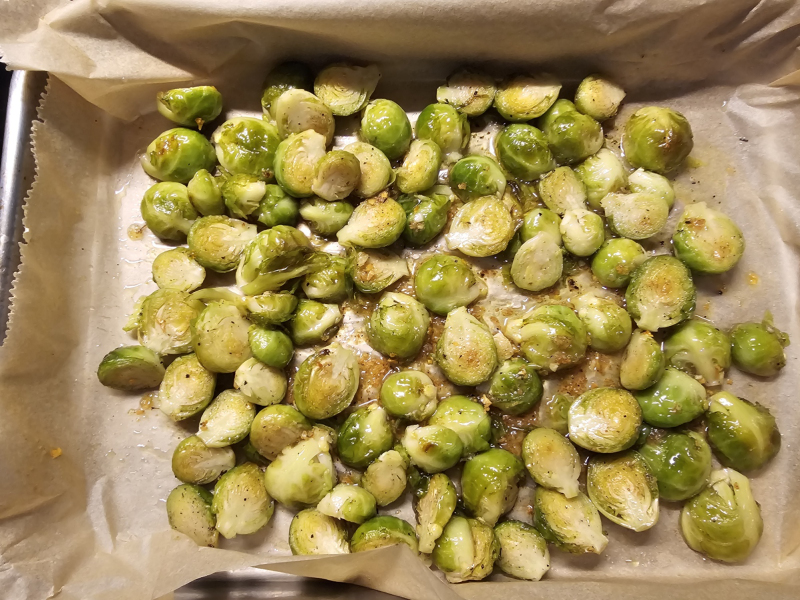 Halbierte Röschen mit Olivenöl und etwas Salz vermengt, bei 200° (Unter-/Oberhitze) ca. 20 Minuten im Backofen gegart, anschließend mit einer heißen Soße aus Butter, Honig, gepresstem Knoblauch und Chiliflocken verfeinert.