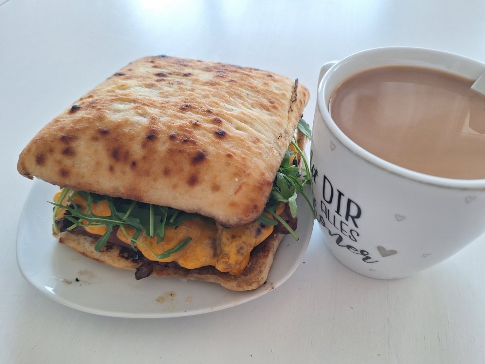 Ribeye in Mayo angebraten, Fladenciabatta im Fett geröstet, das Steak aufgeschnitten und auf der Brotunterseite verteilt, dann mit Cheddar überbacken, danach Ruccola und Deckel druff