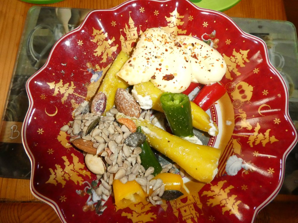 Vorspeise Antipasti mit div. Chili, Sonnenblumenkerne (auch gut als Vogelfutter, die kommen in Scharen, vorgeschält 😂)