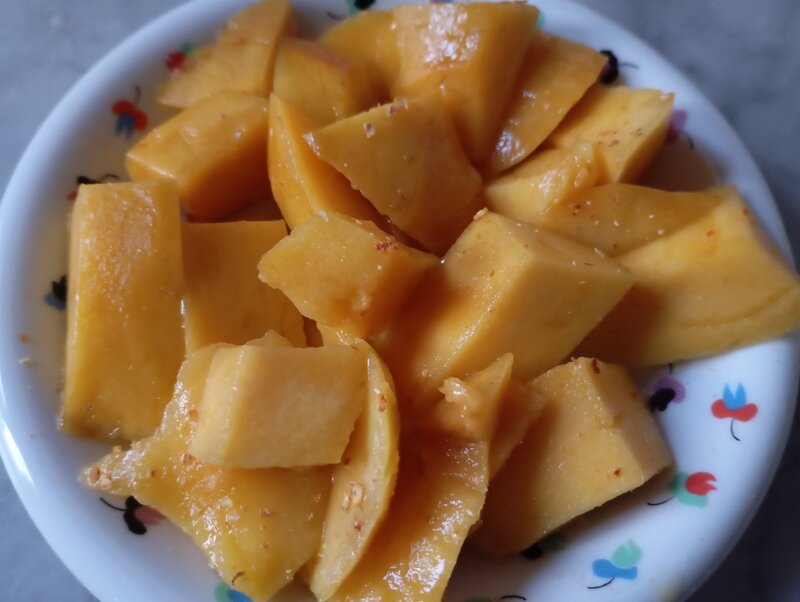 Nach dem Abendessen gab es frische Mango mit Aji Charapita Flocken aus der Gewürzmühle.