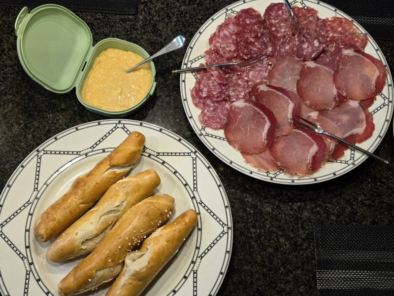 Es gab unvorhergesehenen Besuch aus der Nachbarschaft. Dafür wurden schnell mal ein paar TK-Laugenstangen aufgebacken, Wildschwein-Salami und Schinken und weitere Salami aufgeschnitten und dazu gab es noch Reste von einem selbstgemachten "Obatzten".