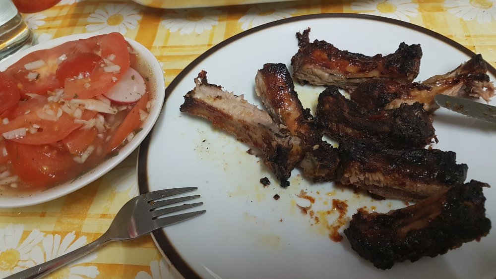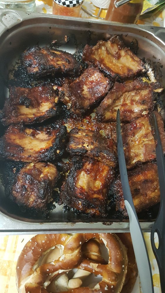 Ripperlessen...mit Tomatensalat und frische Brezen die Ripperl mariniert mit Rocotoglaze und aprokotisiert mit Rocoto-Mango-Marmelade