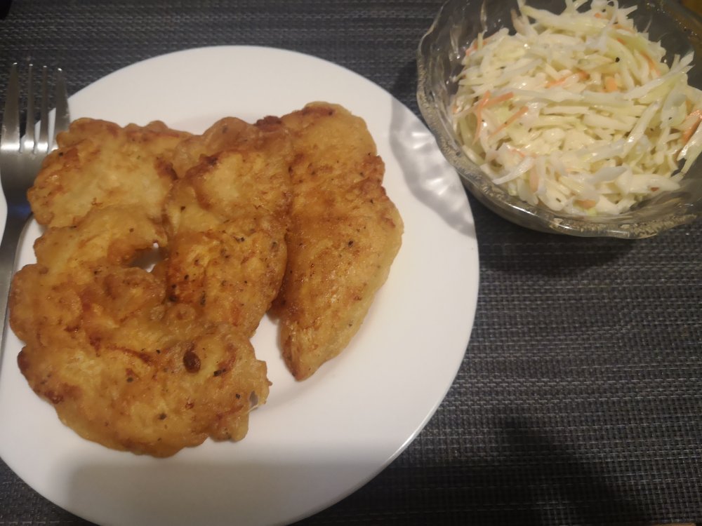 anstatt Rosinen oder Mandarinen & CoIch will das auch...HĂ€hnchenfilet mit bhut jolokia/bierteig Kruste und Cole slaw