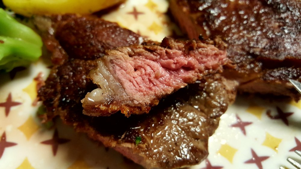 Entrecote und Filets mit Kartoffeln, Brokkoli und Bohnen mit Speck