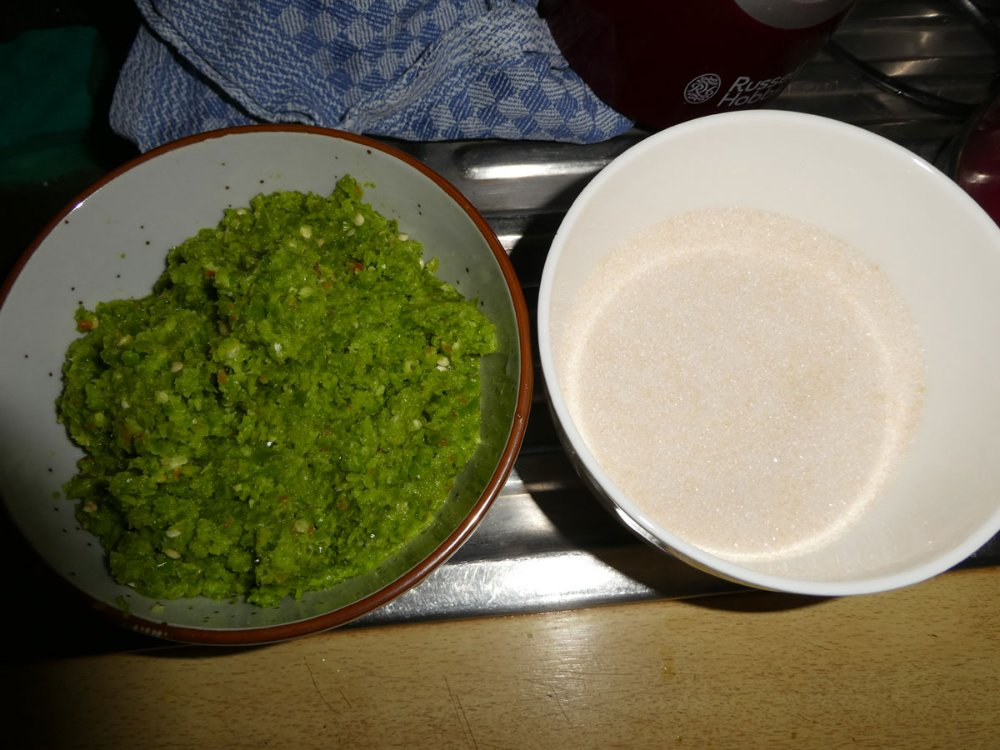 342 g Mushroom (grün) mit 171 g 1:2 Gelierzucker und einer halben ausgepressten Zitrone aufgeköchelt,