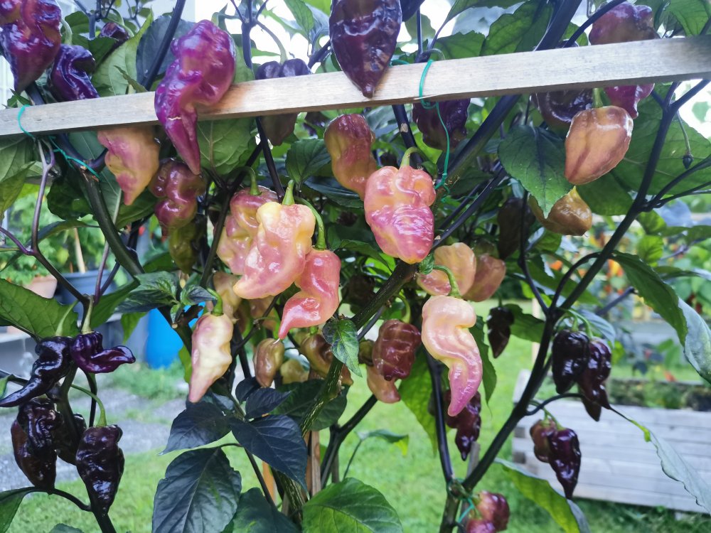 (Projekt No4 x Habanada) x Vincent's Sweet Habanero könnte ich mir gut vorstellen, da sind dann 2 milde Chinensen und eine dunkle Chinense drin, ob man die Schärfe der Piementa Projekt No4 raus bekommt weiß ich nicht, und fraglich ob es dann noch dunkles laub und schattiert Beeren gibt.