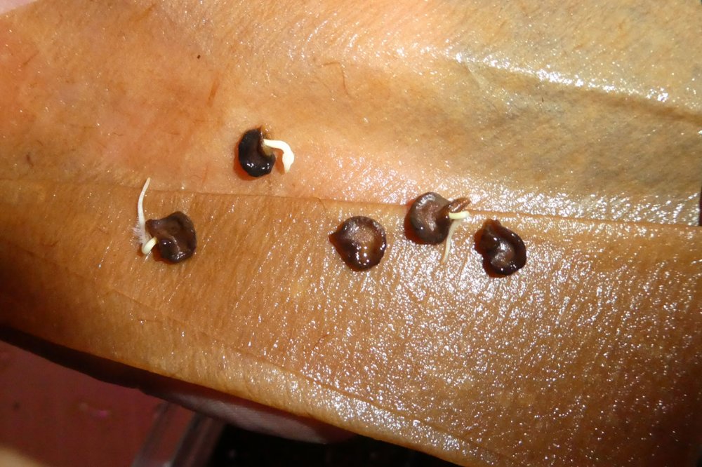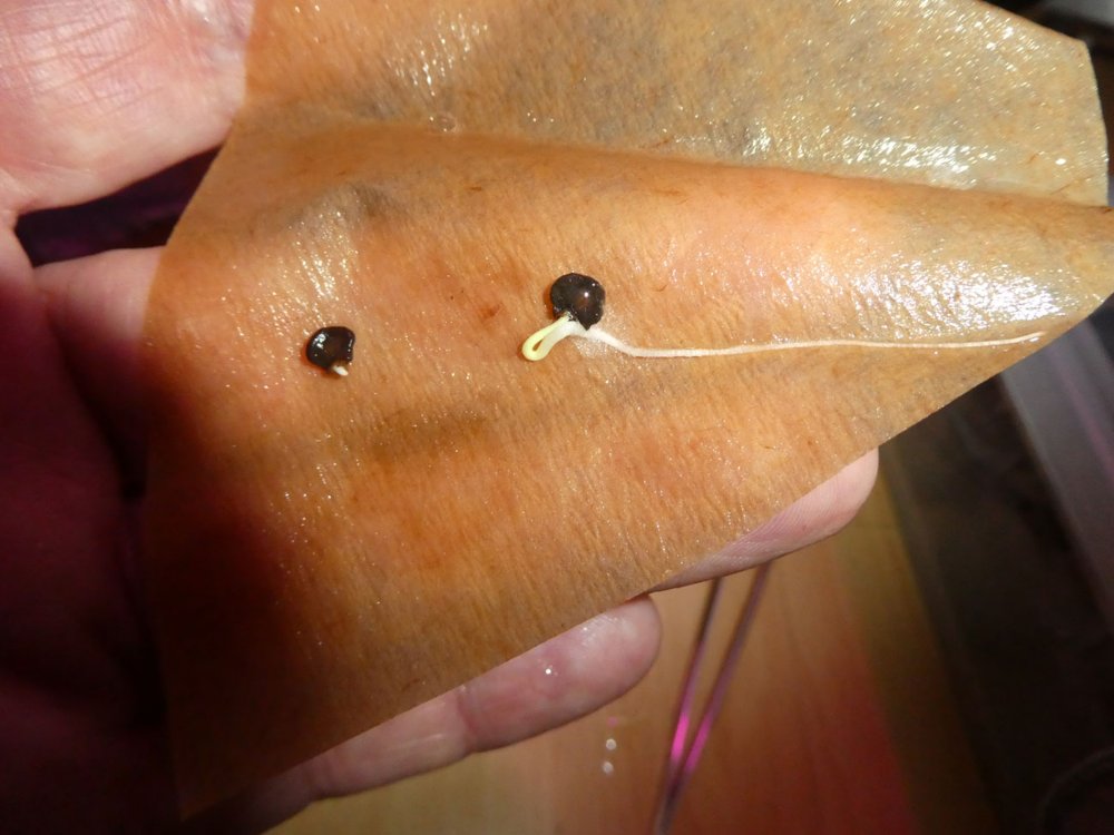 siehe da, nach nur 6 Tagen Keimen in den Kaffeefiltern (Vorteil, sie verhaken sich nicht in Filterpapier) etliche Sorten, wirklich "dunkel" ist es nicht wie man sieht, die schimmern durch das Papier durch 3 Schichten und liegen nicht obenauf.