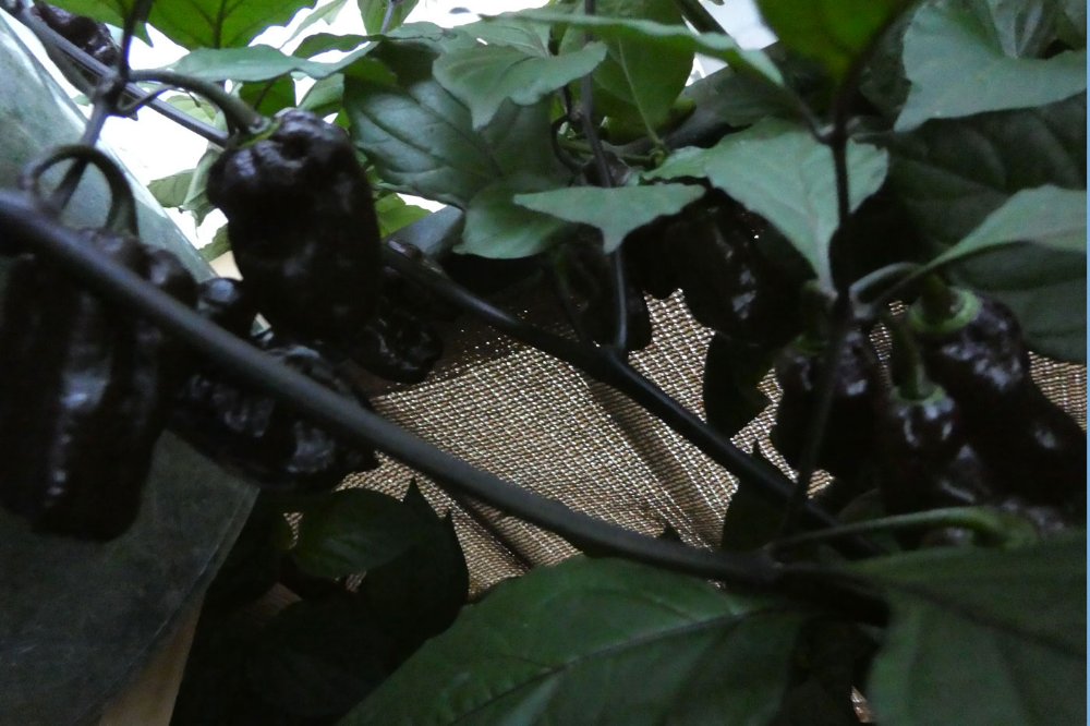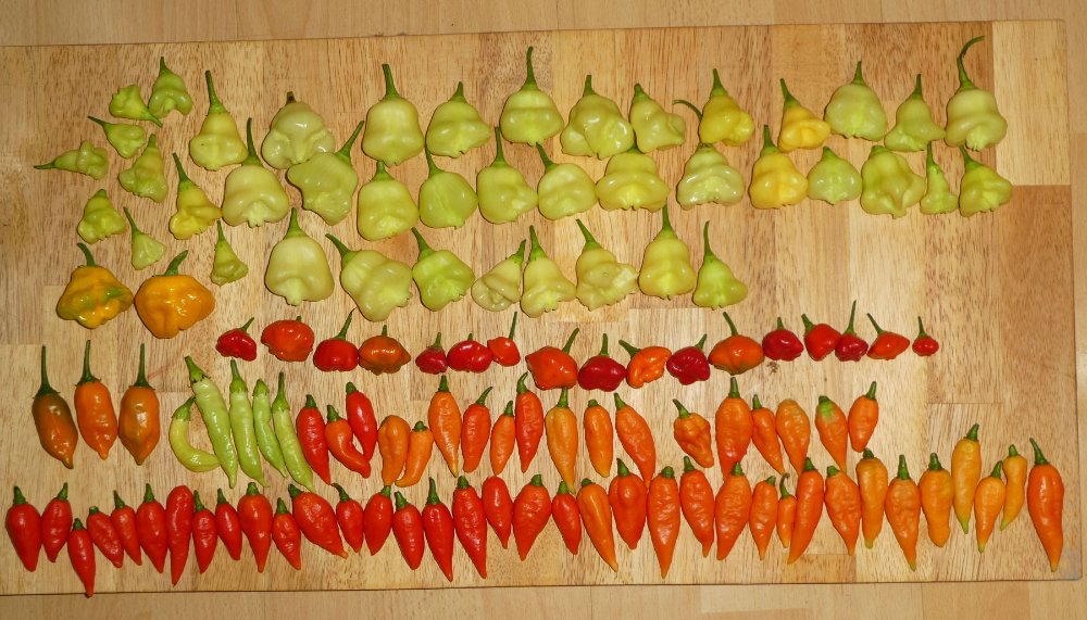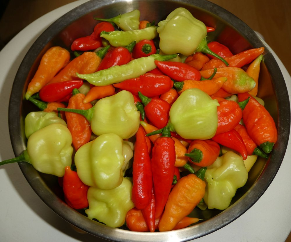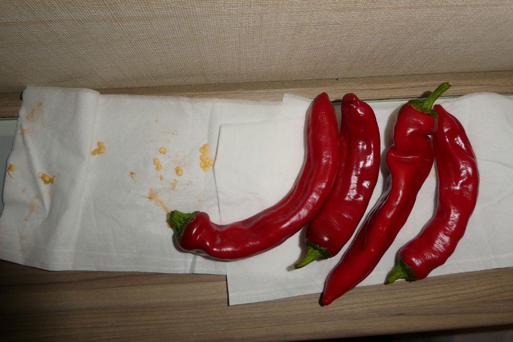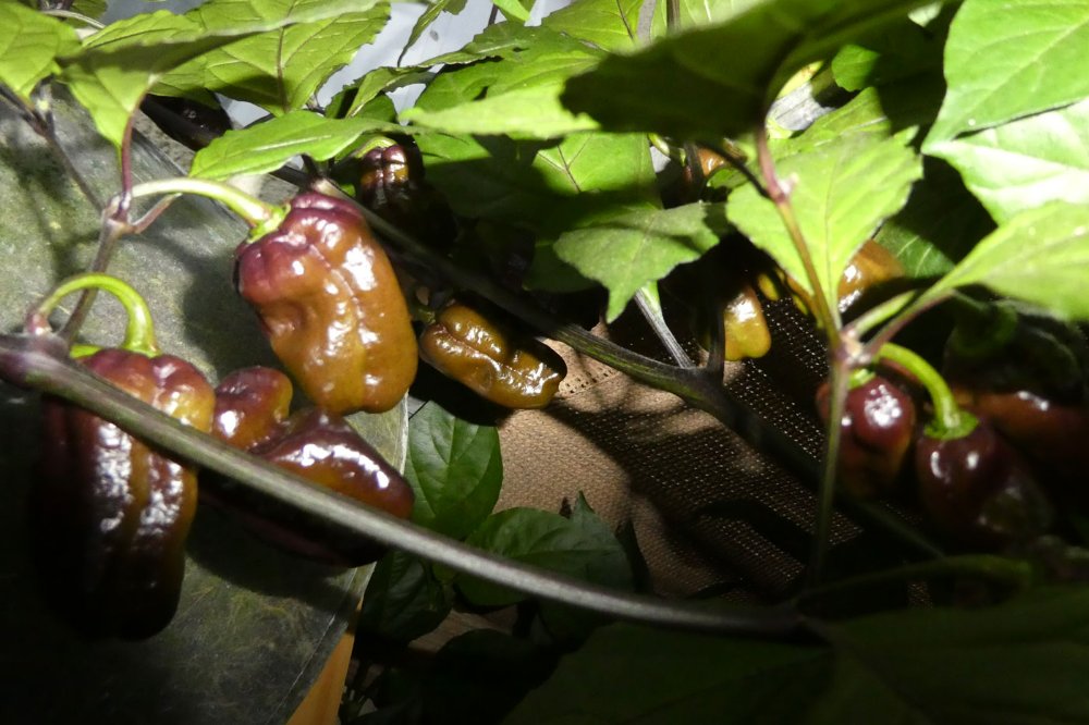 (Die Trinidad Moruga Scorpion hatte ich zur Seite gelegt und finde die nicht mehr, hoffentlich ist die da nicht mir reingerutscht, beim Dörren hat "die Luft in der Bude" gebrannt heute Nacht.