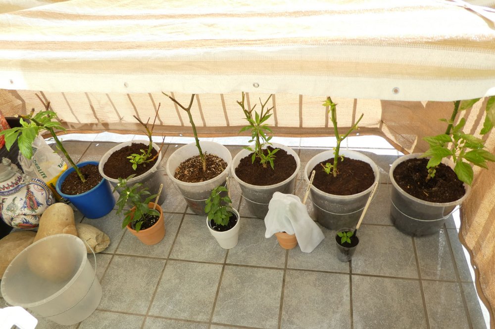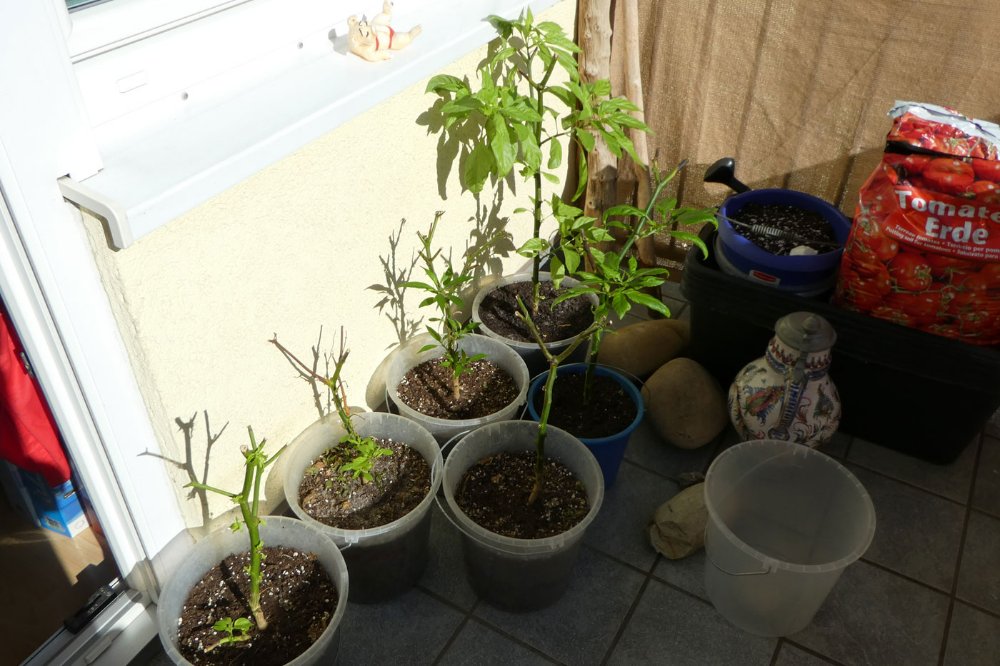 Heute die Überwinterer (20°C) auf dem Balkon im Windschatten, erste Sonnendusche für alle, 2 Wochen früher als geplant,