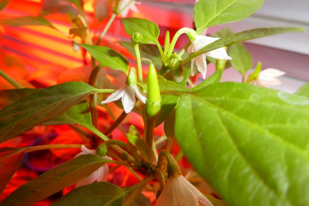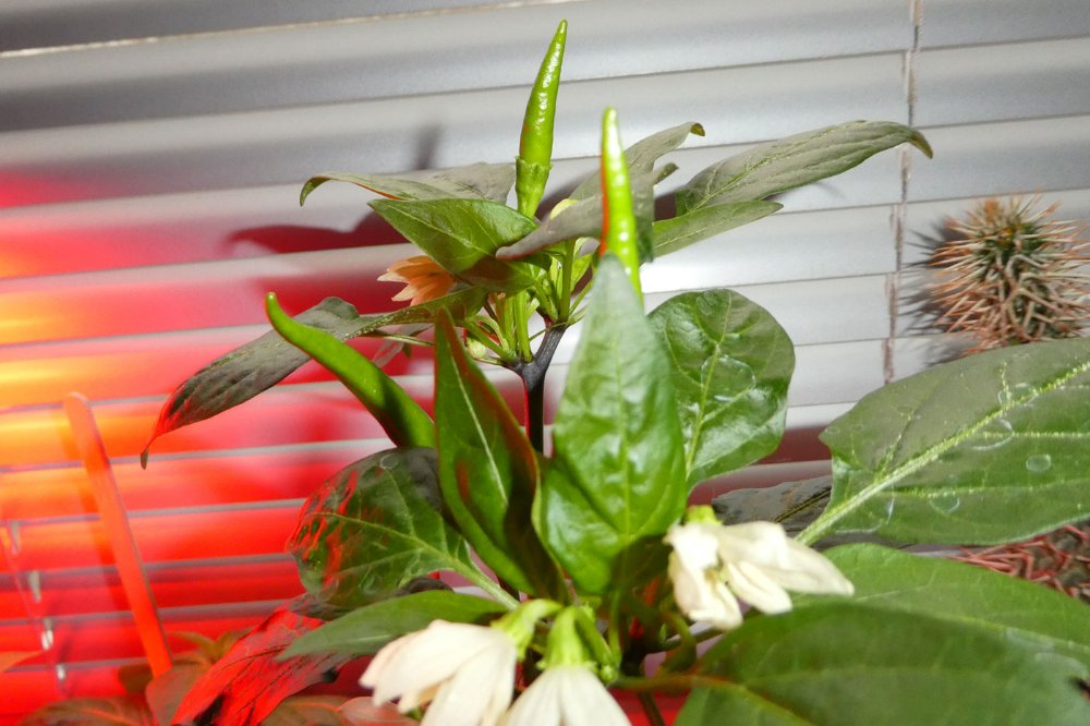 Dennoch wird mit den ersten Beeren 2025 nicht die Moruga wie ursprünglich gedacht, sondern die Takanotsume das Rennen machen. Die inzwischen 2 Knospen der Tepin sind noch geschlossen. Die Lingua di Fuoco bildet ziemlich sicher als nächstes Beeren, die ganze Krone blüht, so klein wie sie ist. Die braucht nochmals neue Schuhe, so siehts aus