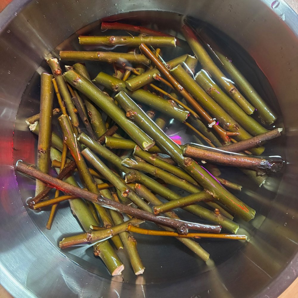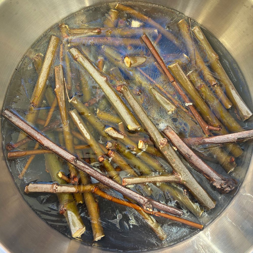 Ich würde die Rinde von den Zweigen abziehen und dann zusammen mit diesen wässern, so können die Planzensäfte besser austreten. ;)