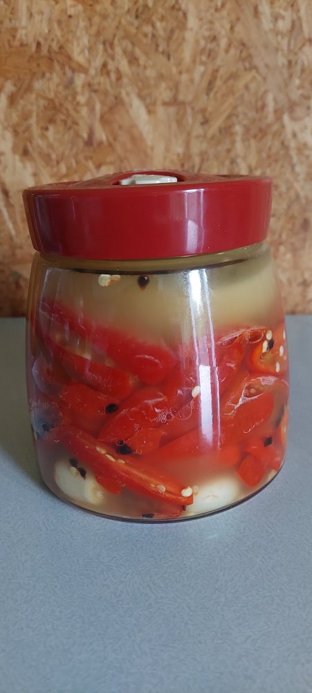 Die geschnittenen Chilis und Knoblauch in ein geeignetes GĂ€rgefÀà geben und mit der Lake ĂŒbergieĂen. Mit einem Gewicht beschweren. Etwa 1 Woche fermentieren lassen.