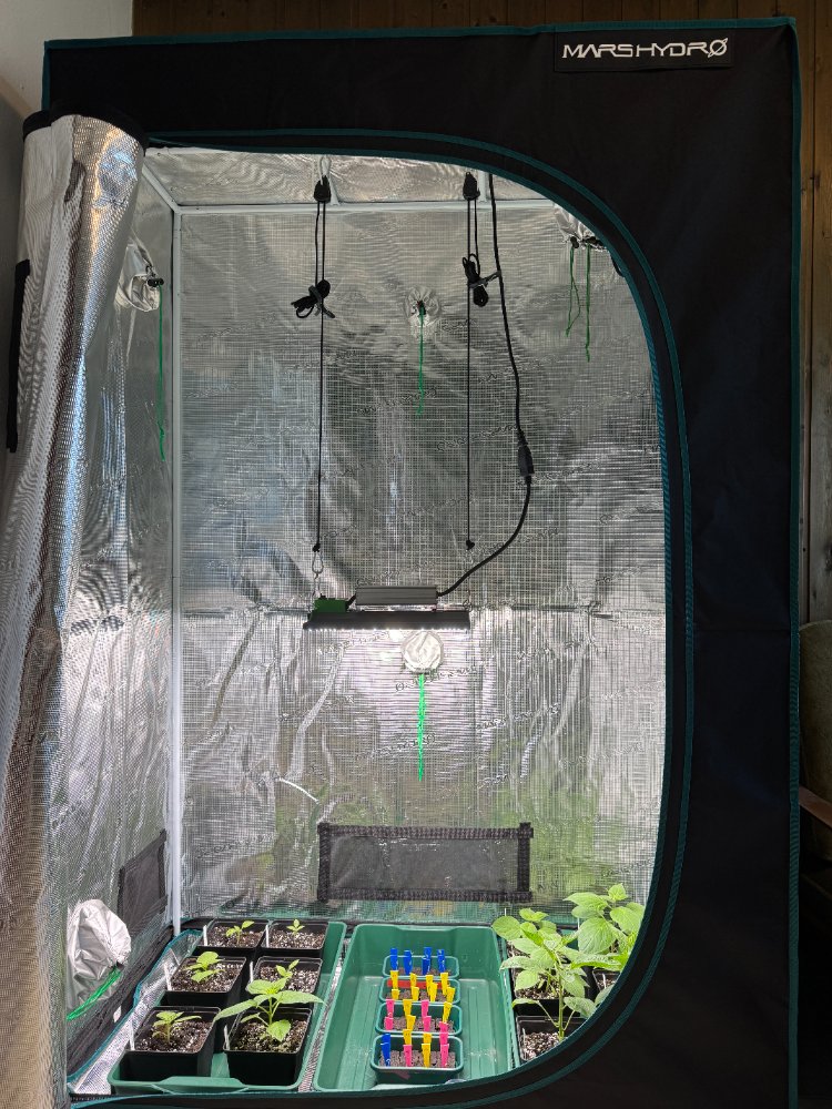 Genutzt wurde das alte, große Growzelt in Mannheim für den ganzjährigen Indoor-Anbau von Chilipflanzen, zuletzt mit einer Rocoto Cabe Gondol. Das neue Growzelt ist momentan nur für die Anzucht von Chili- und Paprikapflanzen vorgesehen. Die Beleuchtung erfolgt weiterhin mit Pflanzenlampen vom Typ Viparspectra P1000.