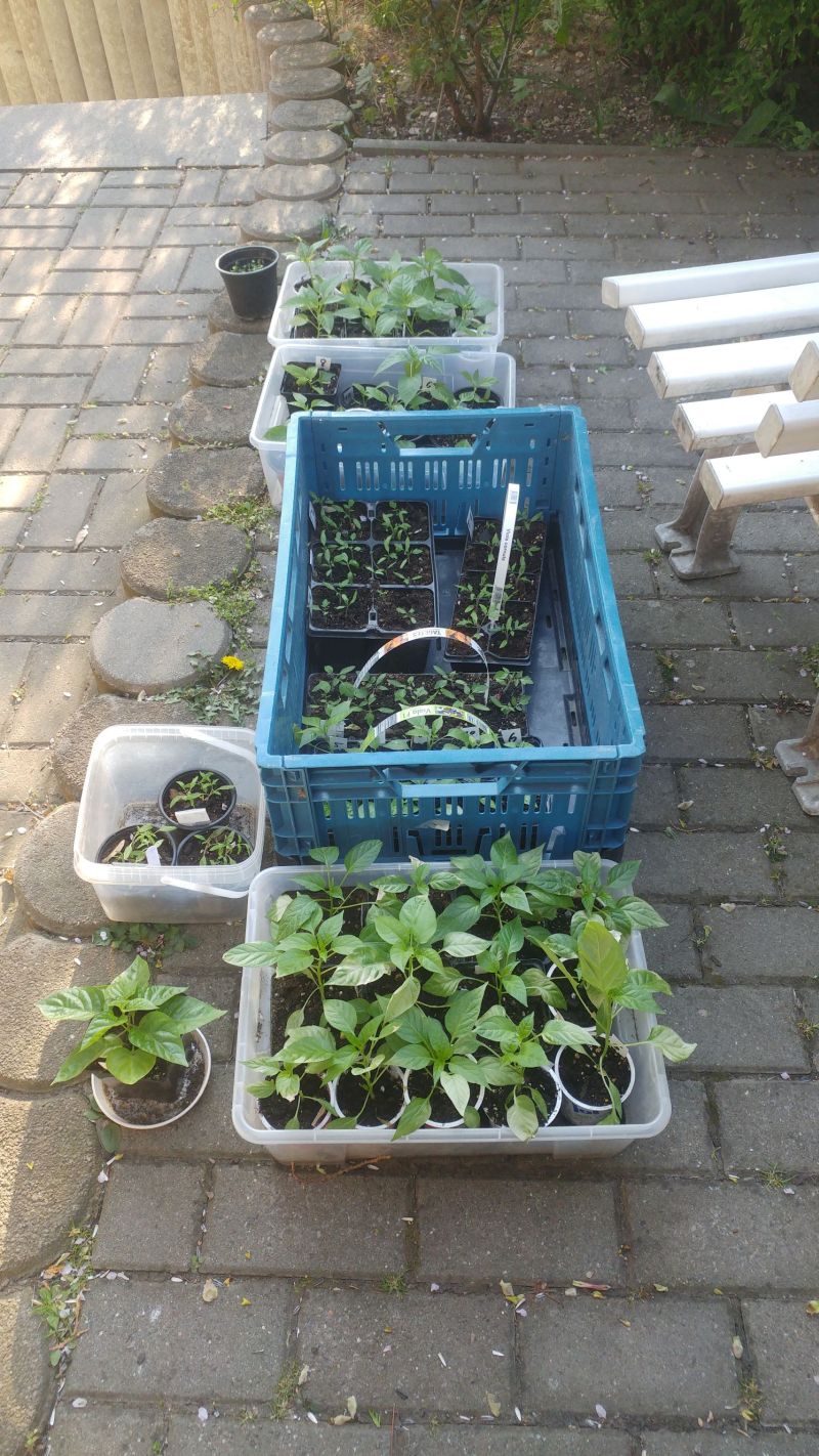 Oder sie erst einmal in den Halbschatten stellen. Die Pflanzen müssen erst einmal einen Sonnenschutz ausbilden. Wenn sie Sonnenbrand bekommen wirft sie das in der Entwicklung zurück, denn Sonnenbrand beschädigt die Blätter irreparabel, d.h. dort wo die Blätter hell oder silbrig in der Sonne werden, sind die Zellen verbrannt. Capsicum annuum sind dabei aber weniger empfindlich als z.B. Capsicum chinense.
