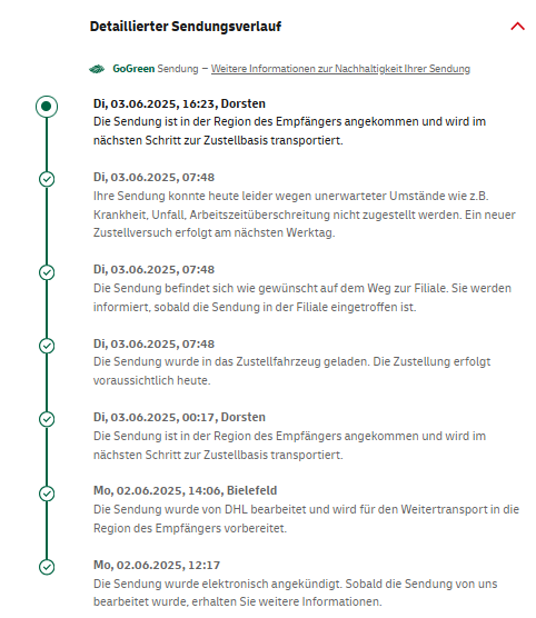 hier der örtliche DHL-Fahrer ist auch topp, meine Bestellung klemmt in Dorsten.