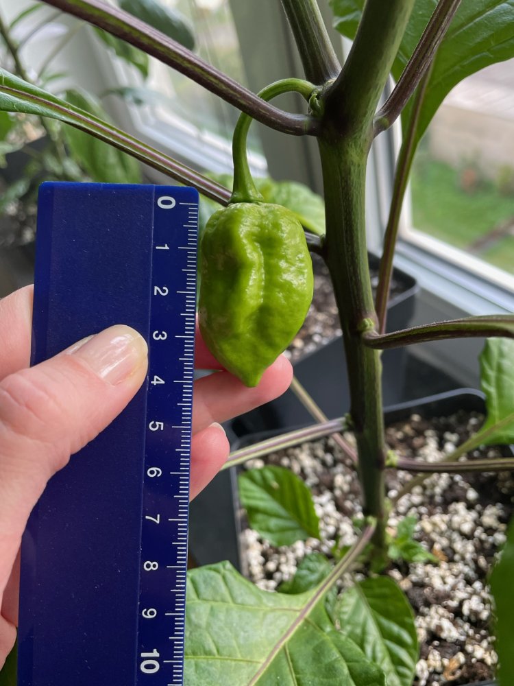 Die erste Beere der Trinidad Moruga Scorpion Red (wahrscheinlich verkreuzt) hat nochmal an Größe zugelegt: