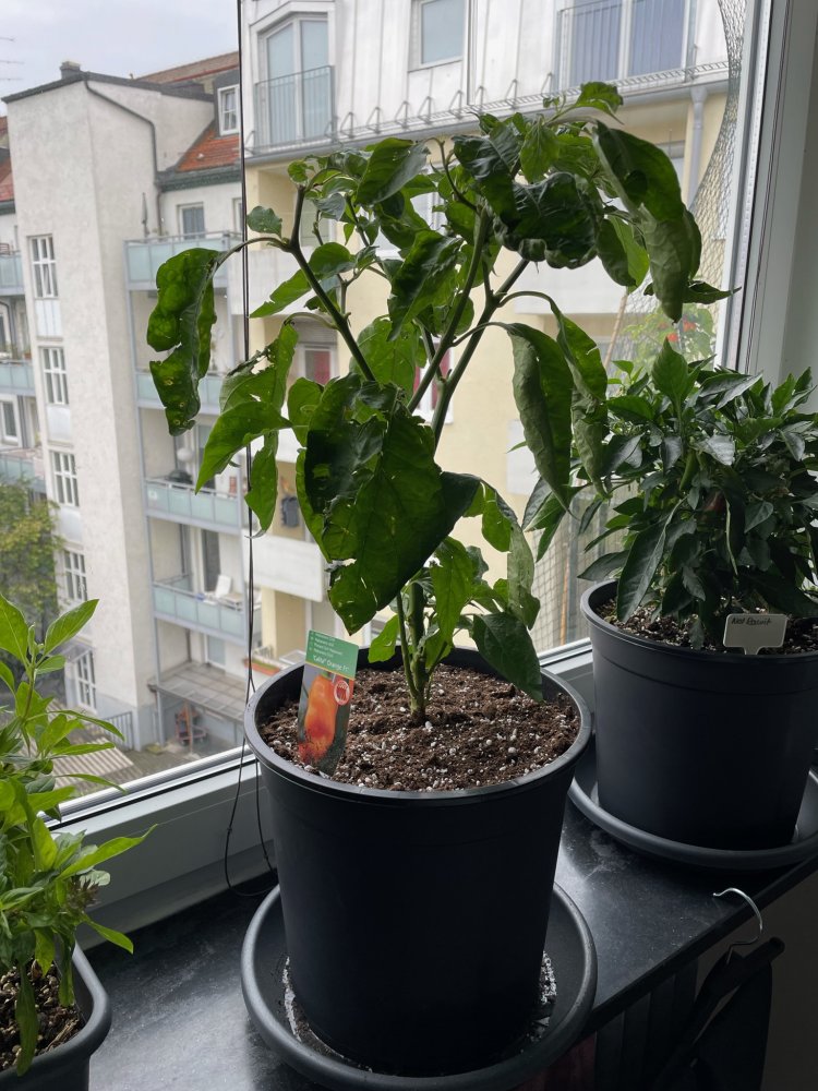 Die Habanero Malaysia hat auf einigen Blättern schwarze Flecken entlang der Blattadern - ich vermute einen Pilz. Ich werde sie noch abernten und dann ist sie die nächste Pflanze, die dem heiligen Habanero geopfert wird. Mit bereits 1,5 kg Ertrag hat sie gute Dienste geleistet.