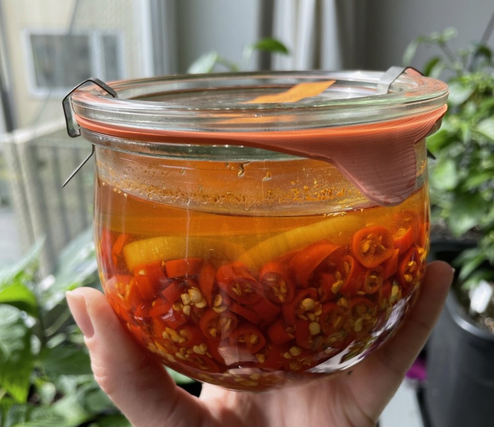 - eine Schalotte, in Scheiben geschnitten als obere Schicht, damit die Chilis nicht gleich an die OberflÀche kommen; zum Beschweren kam noch ein Deckel eines 60er Weck- Rundglases drauf