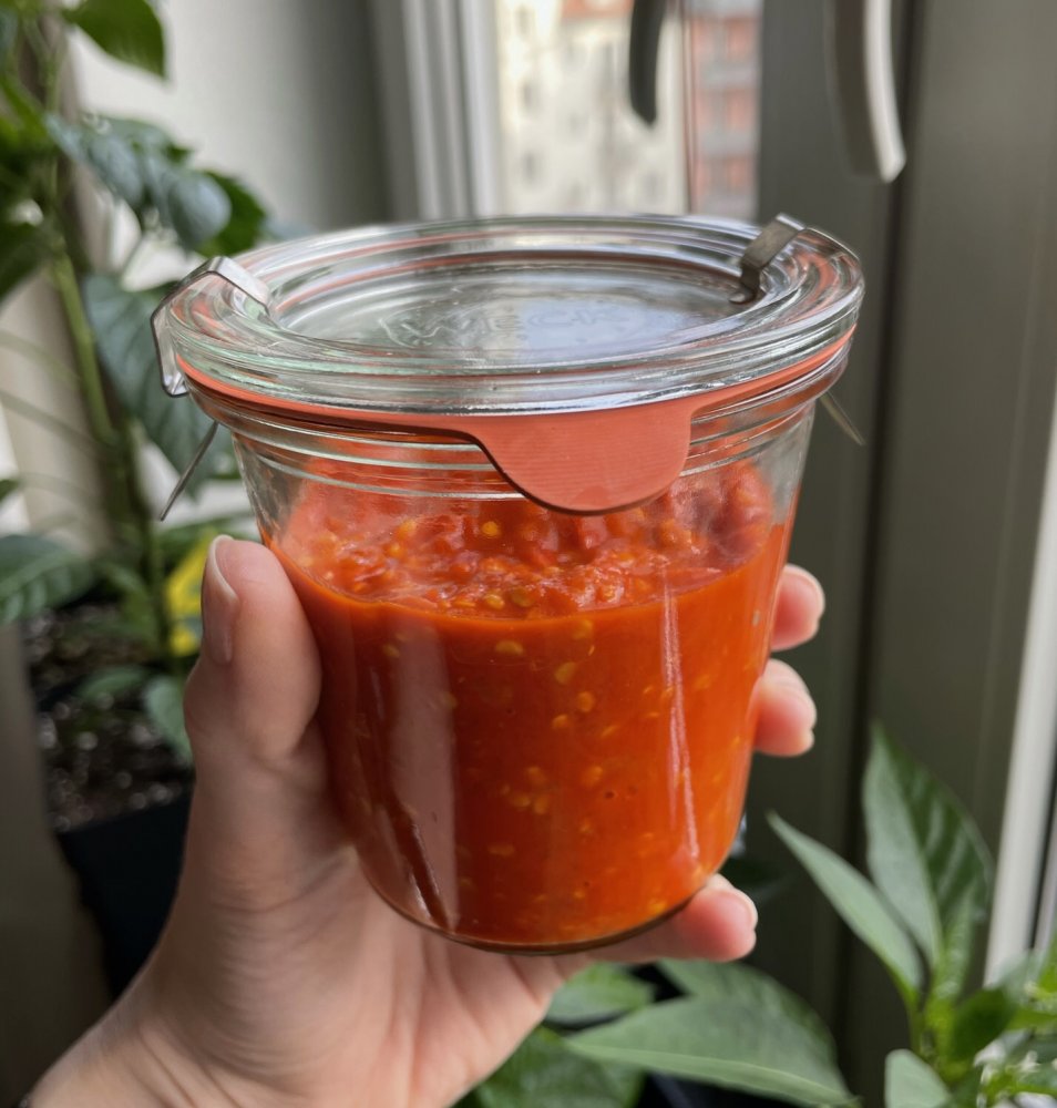 - alles wurde gut durchgerĂŒhrt (und probiert: Geil) und in ein sterilisiertes kleineres WeckgefÀà gefĂŒllt: