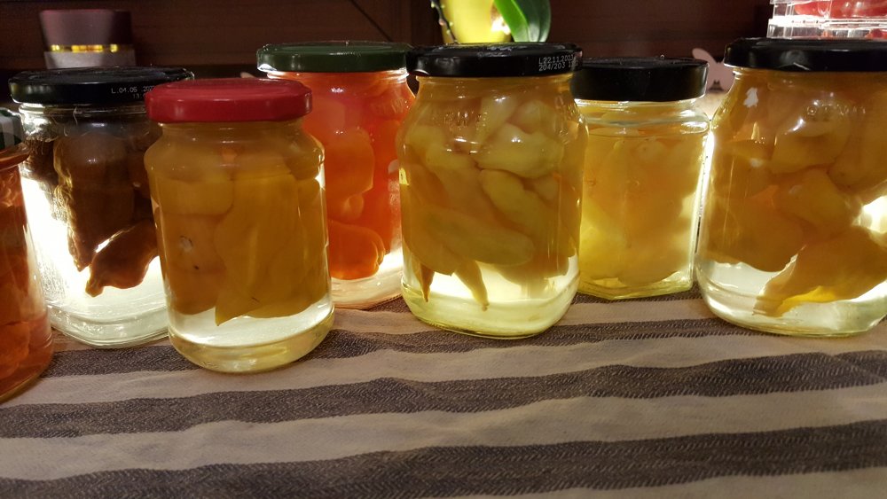 Viele sind noch grĂŒn und liegen bei den andern Chilis zum nachreifen:
