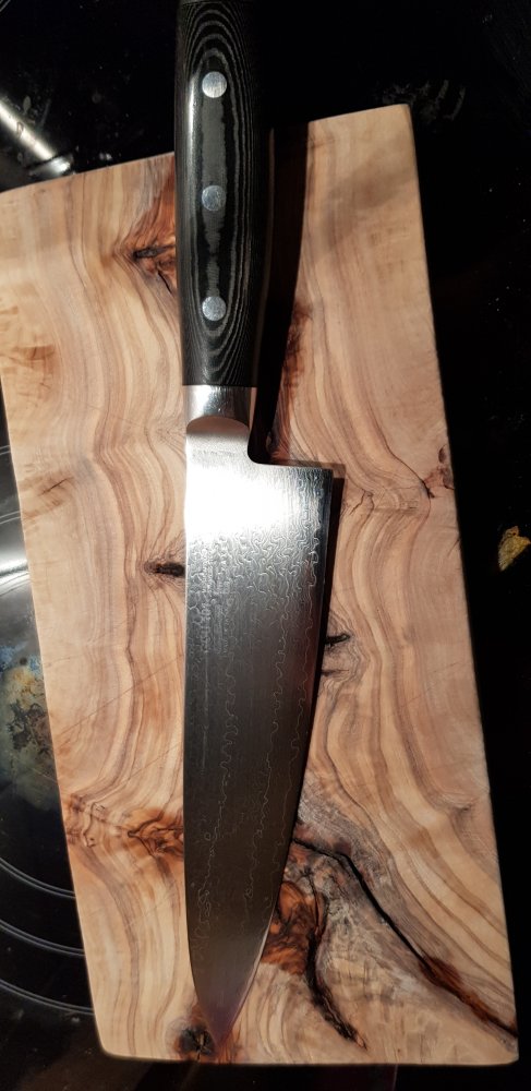 Wenn ihr euch mal ein japanisches Messer kaufen wollt, auch rostfrei empfehle ich diesen Shop. Aber bitte dran denken: Kommt ein Einfuhrzoll drauf und ihr müsst es evtl beim Zoll abholen. Ich empfehle die Kanetsugu pro und JCK Kagayaki Carbonext im Bereich rostfrei. Es ist leider auch so, dass kürzere Messer oft kleine Griffe haben. Mein Kanetsugo Petty ist so ein Fall. Ich habe zum Glück kleine Hände und mein Schatz sehr kleine. HRc 59-61 ist vollkommen ausreichend. Ich hatte mal ein Kamo Nakiri aus Aogami (rostend) da fand ich im Vergleich den Unterschied nicht sooo krass. es sei hier auch gesagt, dass bei sehr harten Messer mit HRc 63 zB auch die entsprechende Schnittkunst erlernt werden muss, das Schneidbrett adäquat sein muss und diverse Sachen nicht geschnitten werden sollten: Fleisch mit Knochen, harte Brotrinde usw. Hier ist die Standzeit eben auch nicht so hoch. Ausnahme das Yaxell Gou.