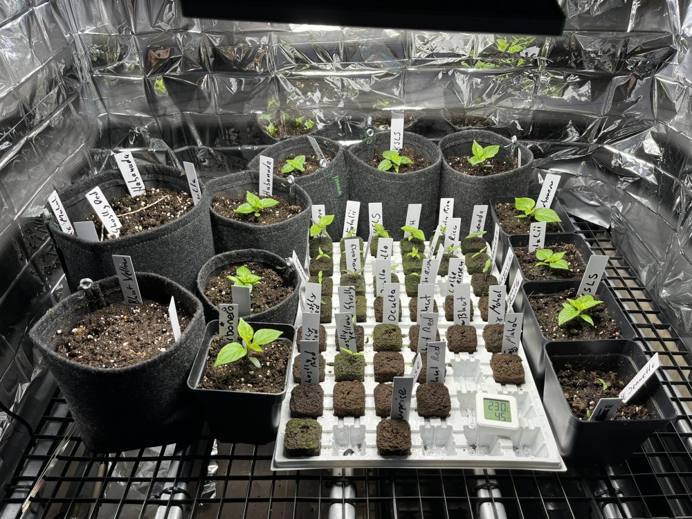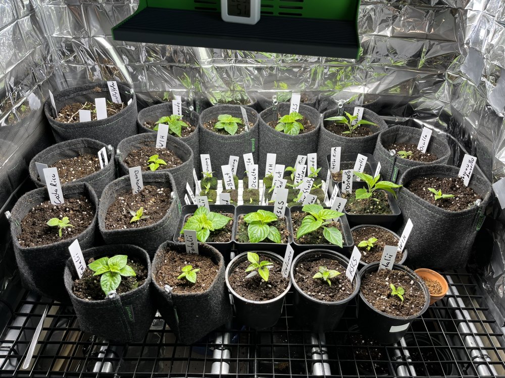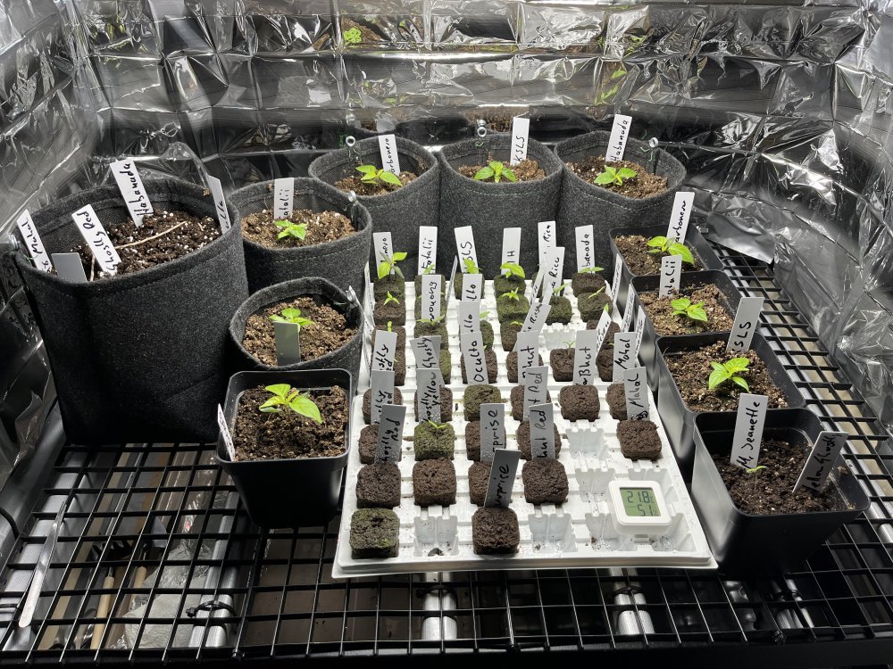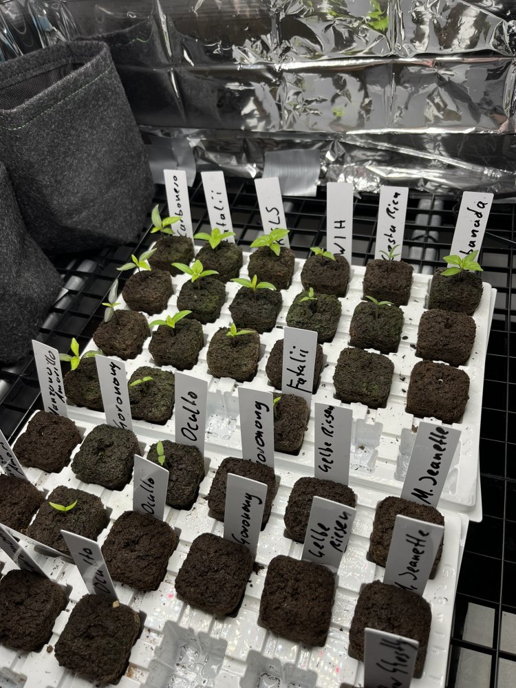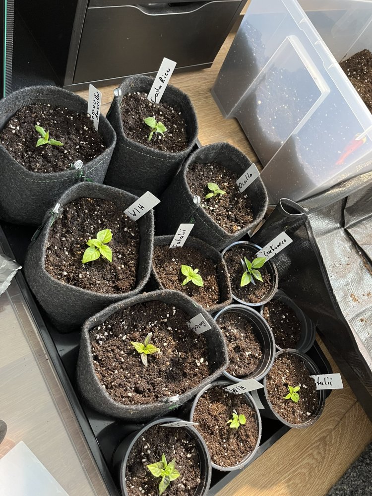 Da ich plane, von jeder Sorte im Sommer nur eine Pflanze zu halten, habe ich von jeder Sorte eine in 2L Gronest Töpfe gepflanzt und die Backups, die hinterher wenn nicht mehr benötigt verschenkt werden in Plastiktöpfe. Die zweit kräftigste