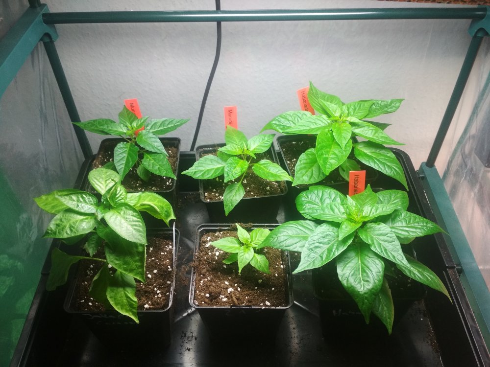 oben meine 5 Jalapeno Caramel und verbliebenen Sugar Rush Stripies aus der Anzuchtwelle von Mitte Januar (eine Stripey hat bereits eine Reise nach Neukirchen-Vluyn angetreten)