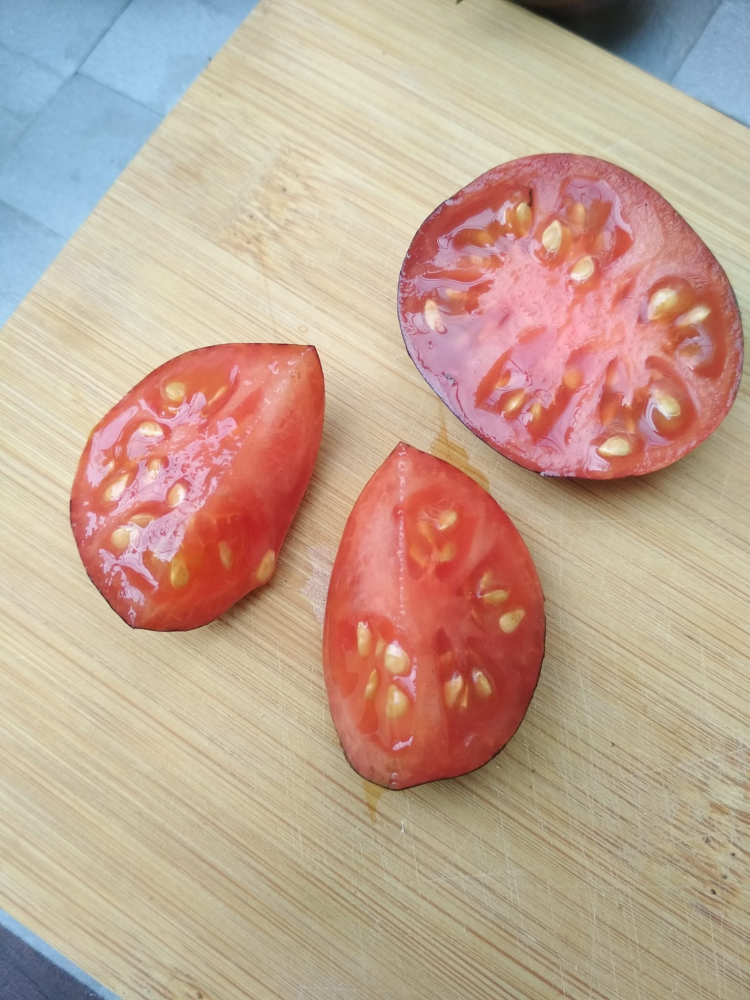 Als Referenz hab ich dann gleich noch eine Striped Roman angeschnitten. Die ist um einiges härter, aber immer noch moderater als bei den "normalen" Tomaten aus dem Konsum...