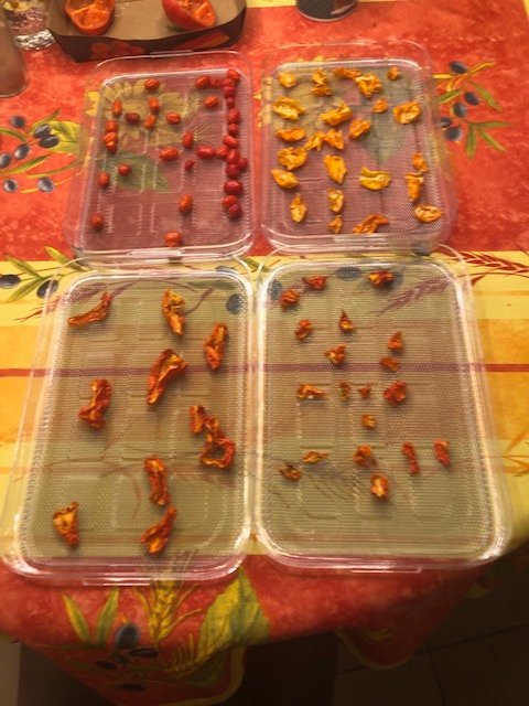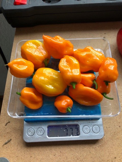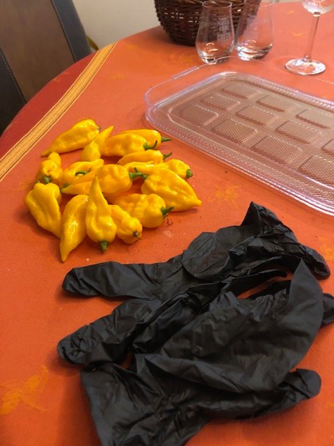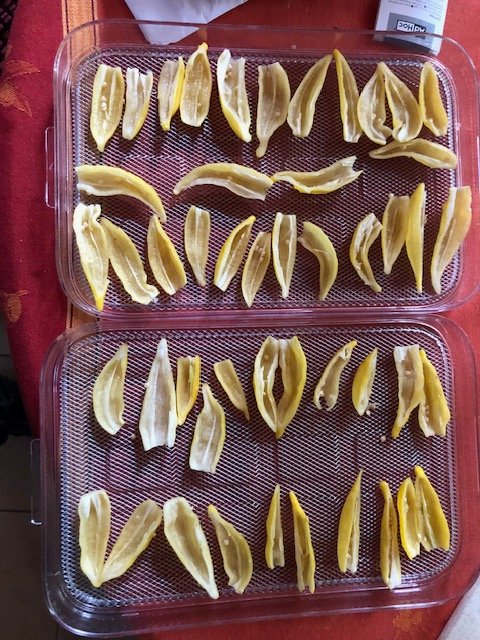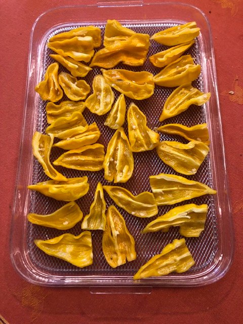 Nachdem meine Samen von der Lemon Drop verschimmelt sind - wohl zu feucht eingepackt - habe ich heute wieder 25 Beeren geerntet und Samen entnommen. Die Hälfte mit 80 Aji Charapita gelb in den Dörrer, von den anderen mal Miniprojekt Chilisalz gestartet. Und dann die letzten Shishitos für den Grill heute abend. Und die ersten Habandas geerntet.