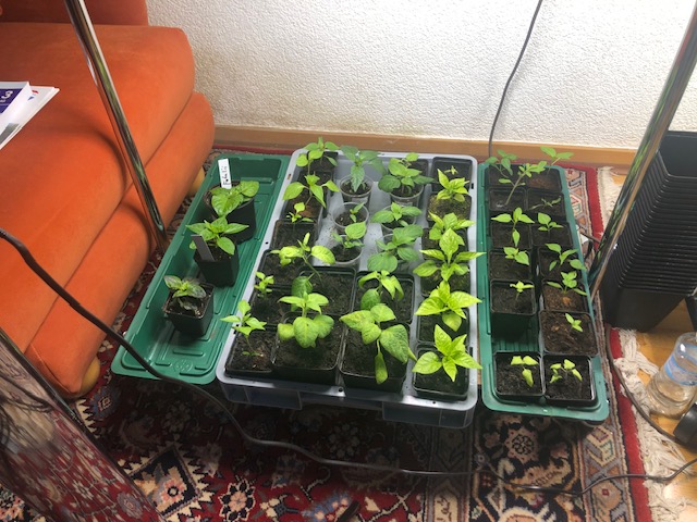 Einige Nachzügler Chilis wanderten in kleine Töpfe und diese sind nun dem Tageslicht ausgesetzt. Heizmatten abgebaut.