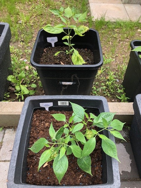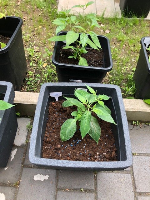 Heute habe ich es endlich mal geschafft, der Rasselbande passende Stäbe zu verpassen und Schilder oben anzubringen, damit man sich nicht immer bücken muss um nachzuschauen, wie das Kind heisst. UND der erste Ansatz einer Blüte bei einer Rocoto mini olive.