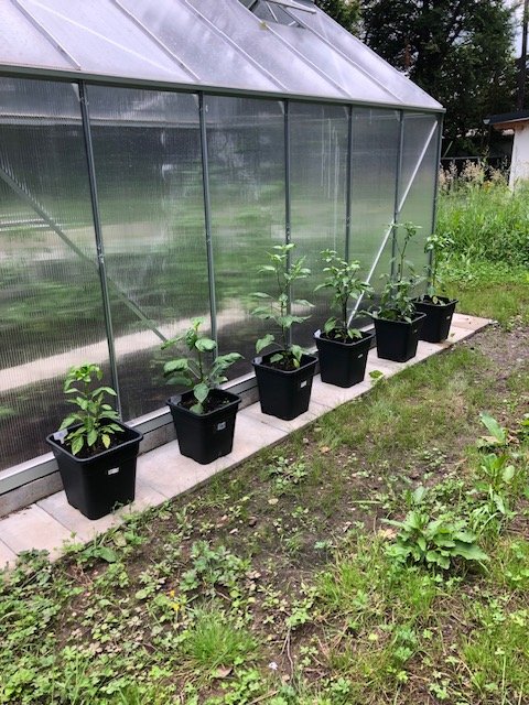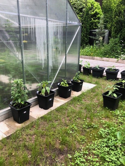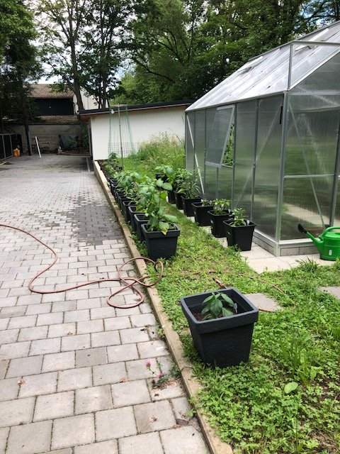 Ich hatte nach den Unmengen von Wasser die letzten ca. 10 Tage die Pflanzen aussen nicht gewässert - ich wollte dass die Töpfe sich mal von der Durchflutung befreien. Auch heute waren es in den GWHs knapp an die 30 Grad. Beim Kontrollgang heute abend musste ich bei der Lombardo an der Garagenwand einen erbärmlichen Zustand feststellen. Auch im neuen GWH sahen die Tomaten nach DURST aus. Bei der Lombardo alle Blätter und Blüten auf vertrocknet und die eine kleine dünne Beere erbärmlich, Ich habe nun mal allen Chilis Wasser gegeben, teils auch die Blätter nass gemacht und den Tomaten in den GWHs den Boden ordentlich nass gemacht. Einige der Tomatensorten sind bereits über 1,5 Meter hoch - aber dass man denen beim wachsen zusehen kann, ist ja bekannt.