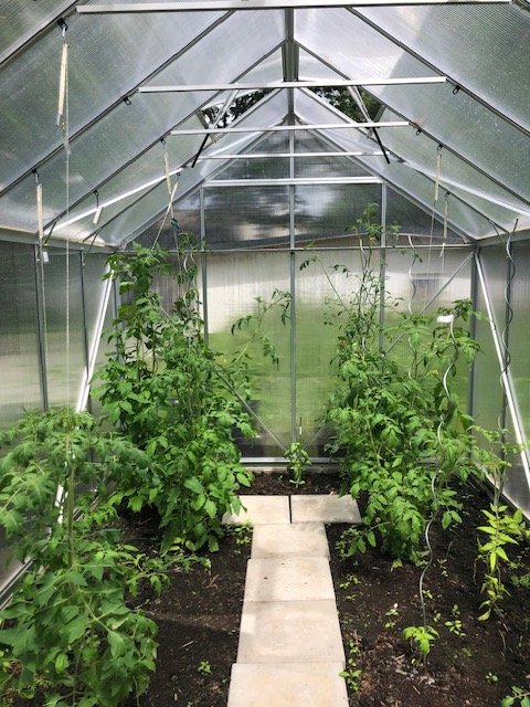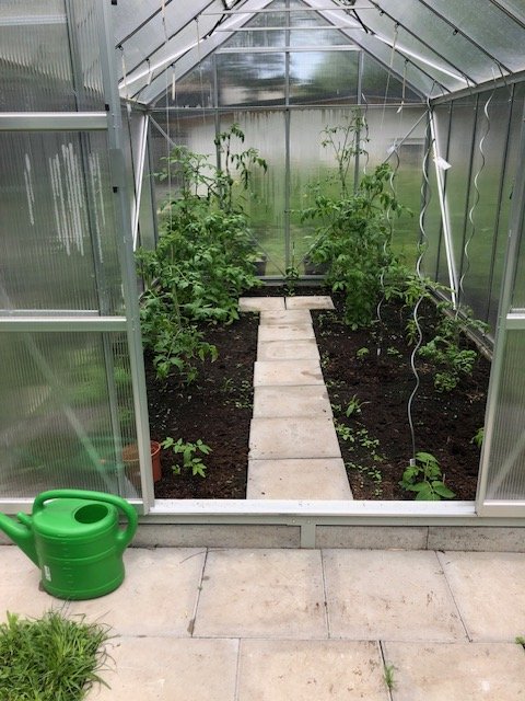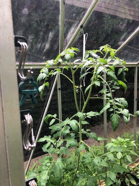 Ich musste eben mal den Tomaten hinten im neuen GWH mehr Stäbe verpassen. Die Erde mit dem Pferdemist vom März scheint den Tomaten nicht zu gehaltreich. Die frühen (29.02.24 gesähten) sehen gesünder aus als vor ca 4 Wochen. Die rechts hinten strebt zur Decke, das wird es bald Zeit zur einen Schnitt.