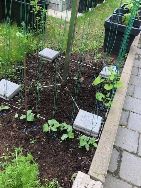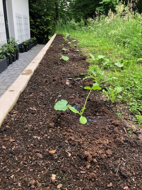 Einige Tomaten zeigen ziemliches Blattwachstum - die grösste (Sorte unbekannt) ist im GWH über 2 Meter und die Johannisbeertomate an der Garagenwand so bei knapp 1,80 angelangt. Die Kürbisse wachsen auch schön (Bild 3 ein Spaghettikürbis). Und ich habe zwei Tabakpflanzen bekommen - mal schauen, wo die hinwandern, die sollen ja recht gross werden, wenn die anfangs nicht von den Schnecken gefressen werden.