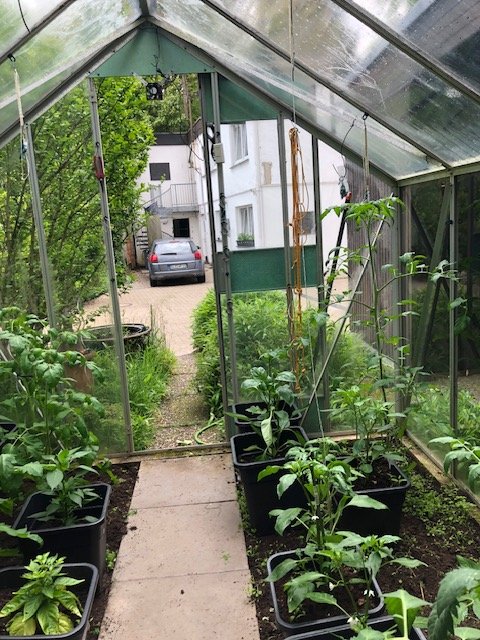Nach 2 Wochen mal wieder aktuelle Bilder aus dem alten Gewächshaus. Es entwickelt sich dort sehr schön. Im Gegensatz dazu sind die Töpfe draussen mal wieder quatschnass. Und ein Glasmalerei-Kunstwerk "Hiking trails of snails at night".