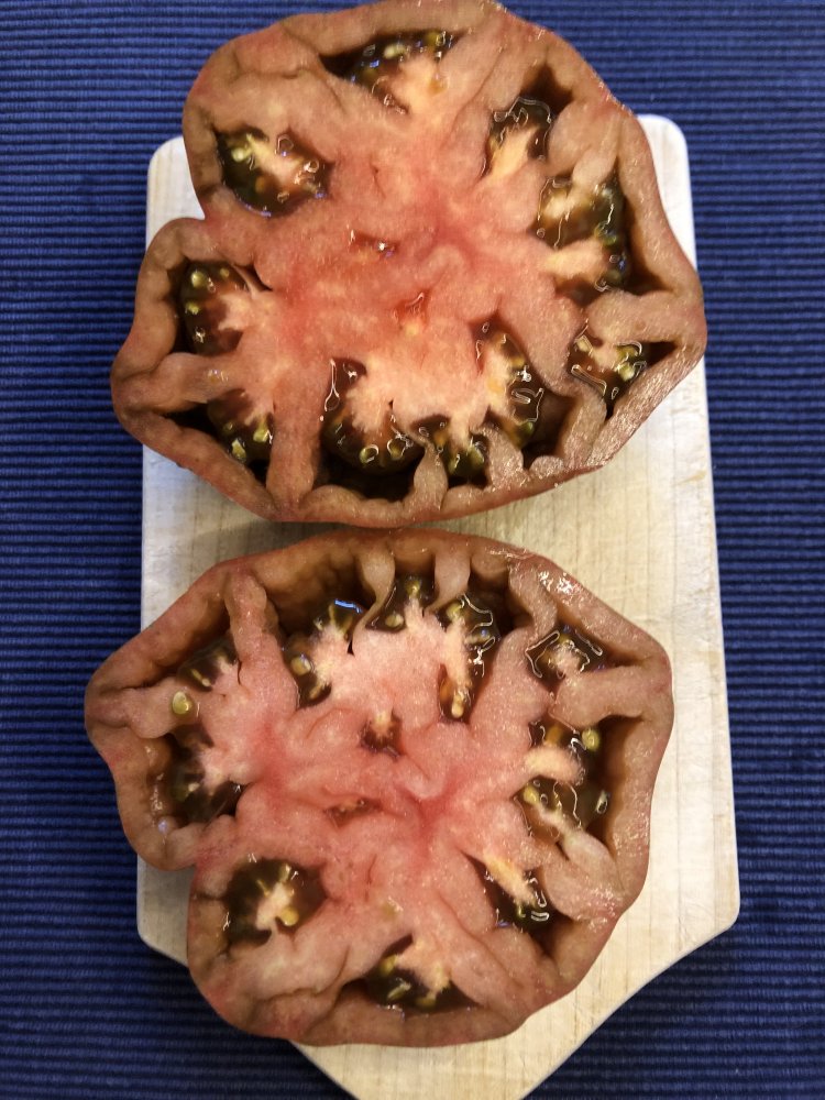 Wow! Wahnsinnstomate, da kriege ich direkt bock auf tomate mit salz und pfeffer!Das Monster, dass sich als Black Krim geoutet hat, wurde soeben gererntet und auf die Waage gelegt. 398 Gramm zeigte die Waage an. Heute Abend ist das Aufscheidenb, Samenentnahme und Verkostung auf dem Plan.