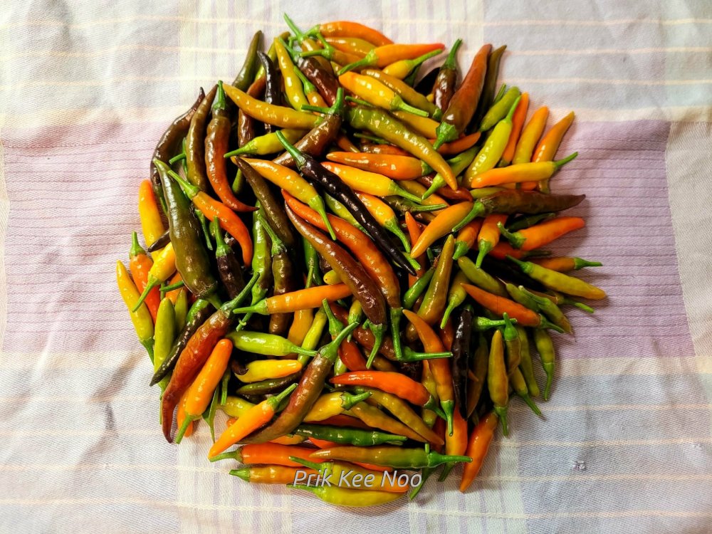 Der oben gezeigte Haufen durfte noch etwas nachreifen und der Großteil davon wurde gestern und heute zu Thai-Chiliflocken verarbeitet.