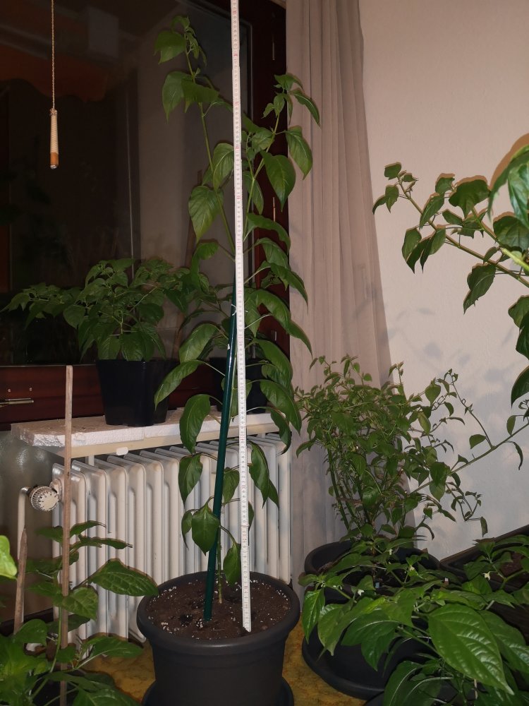 Ist auch sortenabhängig. Die Tepin, die ich regelmäßig anbaue, hatte auch schon mal einen kerzengeraden Stamm von 1,70cm ohne großartige Verzweigungen. Diese Sorten profieren vom Kappen der Triebspitze.