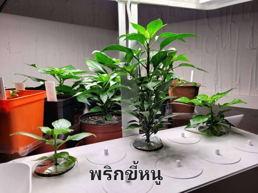 Heute fangen wir mal bei den Hydros an. Die Piri Piri wird jetzt regelmäßig gestutzt, so dass sie nicht in die Lampe wächst. Macht aber nichts, sie treibt dafür an anderen Stellen wieder aus. Die beiden Prik Kee Noo Suan haben, genau wie die Kollegen in Erde, immer mal wieder helle Stellen. Ist wohl bei denen einfach so, wachsen trotzdem immer weiter. Und überhaupt, Prik Kee Noo Suan sollte eigentlich eher kleinere und schmalere Blätter haben, so wie die Piri Piri. Deshalb habe ich die Sorte auch für das Hydro-Experiment ausgewählt. Keine Ahnung, vielleicht liege ich auch falsch, bin auf jeden Fall mal auf die Beeren gespannt... 😆
