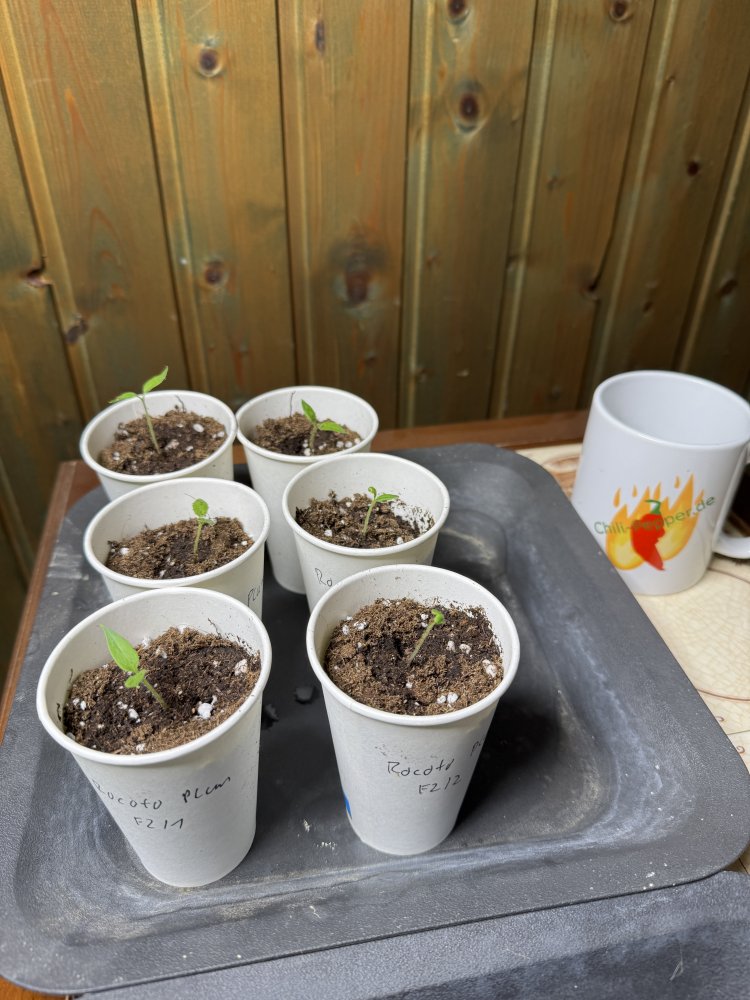 Die drei aus der Linie von meinen Pflanzen sehen gut aus, die eine aus Linie von Rudi ist etwas mikrig (später gekeimt). Ich will Umtopfen noch etwas herauszögern, aber Wurzeln sind am Rande der Becher bereits zu sehen, In den mittleren Becher sind zwei Pflanzen geraten, also sind es eigentlich 4 aus der einen Linie.