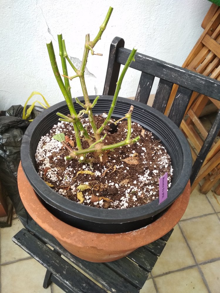 Wenn ich die demnächst aus dem Eimer nehme, gibt es noch einen Feinschliff, falls die vorschnell wieder mit Neuaustrieben loslegt (womit ich bei der fortdauernden Wetterlage jedenfalls mit rechne).