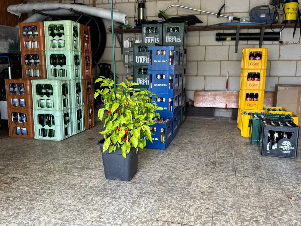 Im Vordergrund eine Snackpaprika Pflanze, im Hintergrund ein Teil der Getränke, die mein Schwiegersohn in Spe geordert hat für die morgige Hochzeit - Fest im Garten. O weia, der englische Rasen wird leiden.