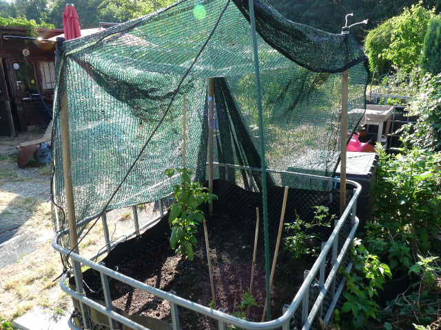Für die Rocoten habe ich ein Schattiernetz aufgebaut. Auch wenn ich nicht mehr dran glaube. Ich werde den Platz wohl für Radieschen nutzen oder Rettiche.