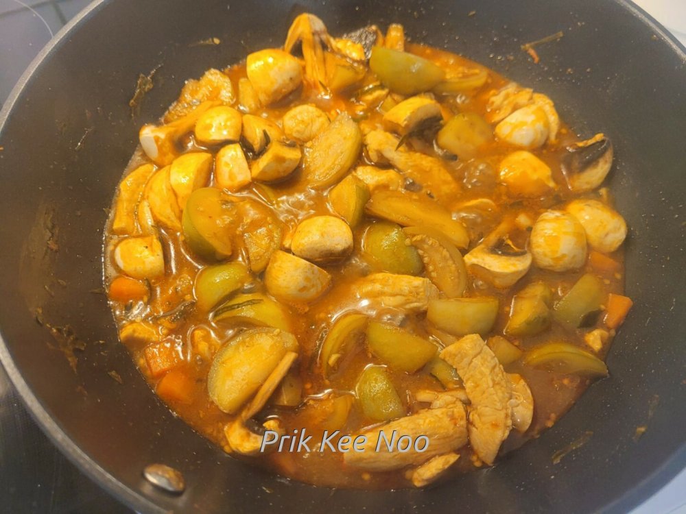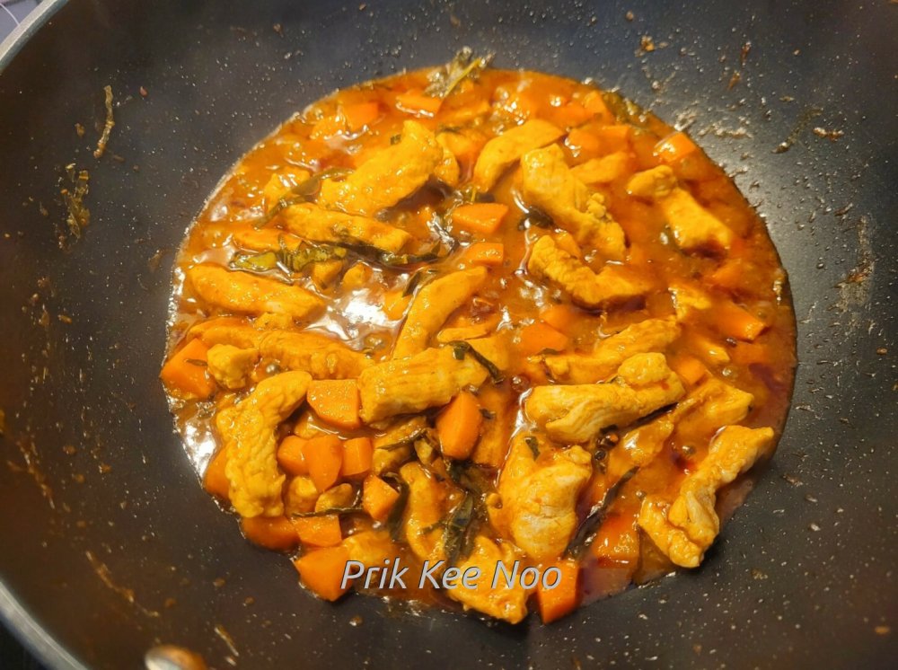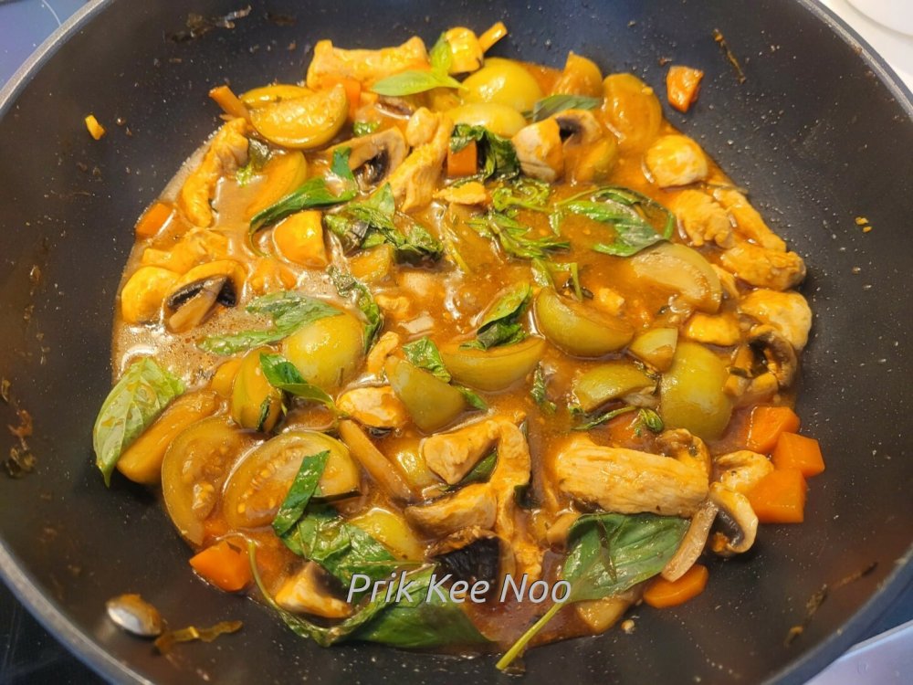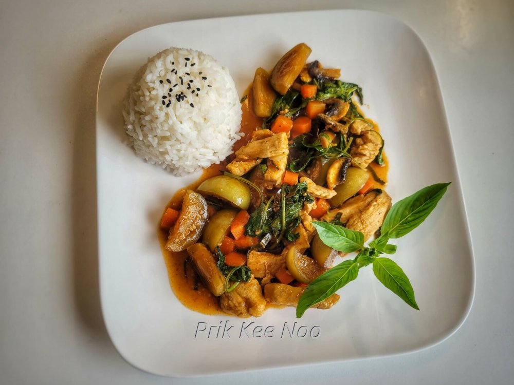 Stir-Fry mit Curry-Paste und Hähnchen-Fleisch, Pad Prikkaeng Kai (ผัดพริกแกงไก่ใส่มะเขือ)