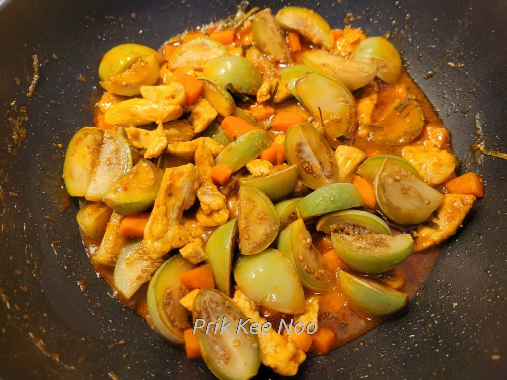 Am häufigsten wird das mit grünen Bohnen gemacht, es gibt aber auch die Variante mit Thai-Auberginen. Da wir noch welche von letztem Jahr im Gefrierschrank hatten, haben wir uns für diese Variante entschieden. Wer aber keine Thai-Auberginen hat/findet, einfach grüne Bohnen nehmen.